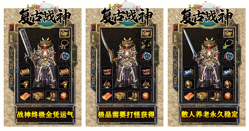 【特色玩法】:1.80战神终极→散人好混→一切靠打→BOSS超多→最后一片散人净土!